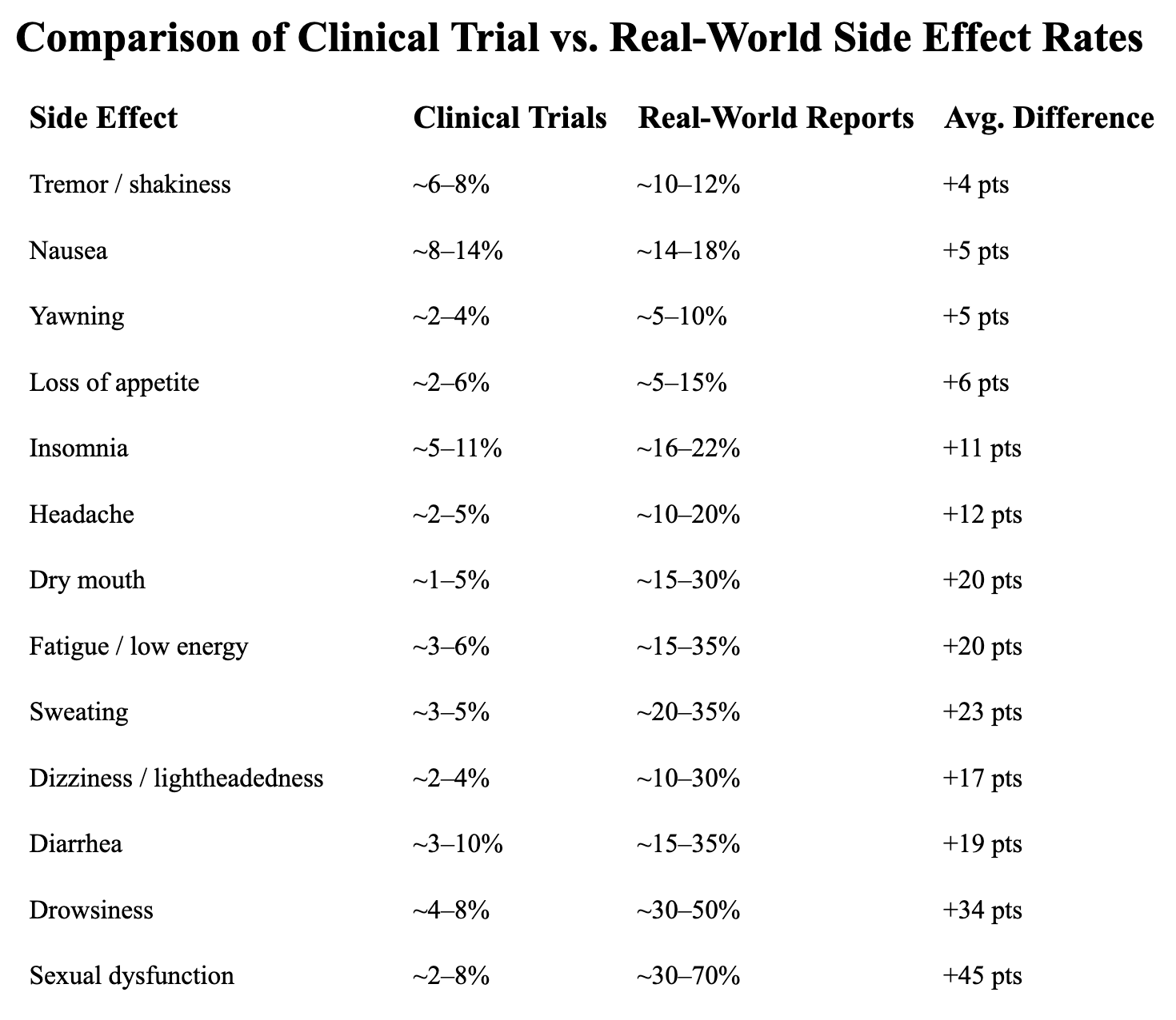 As you can see, while some side effects — like tremors, nausea5, yawning and appetite changes — show somewhat similar rates across clinical trials and real-world reports, others differ substantially.6