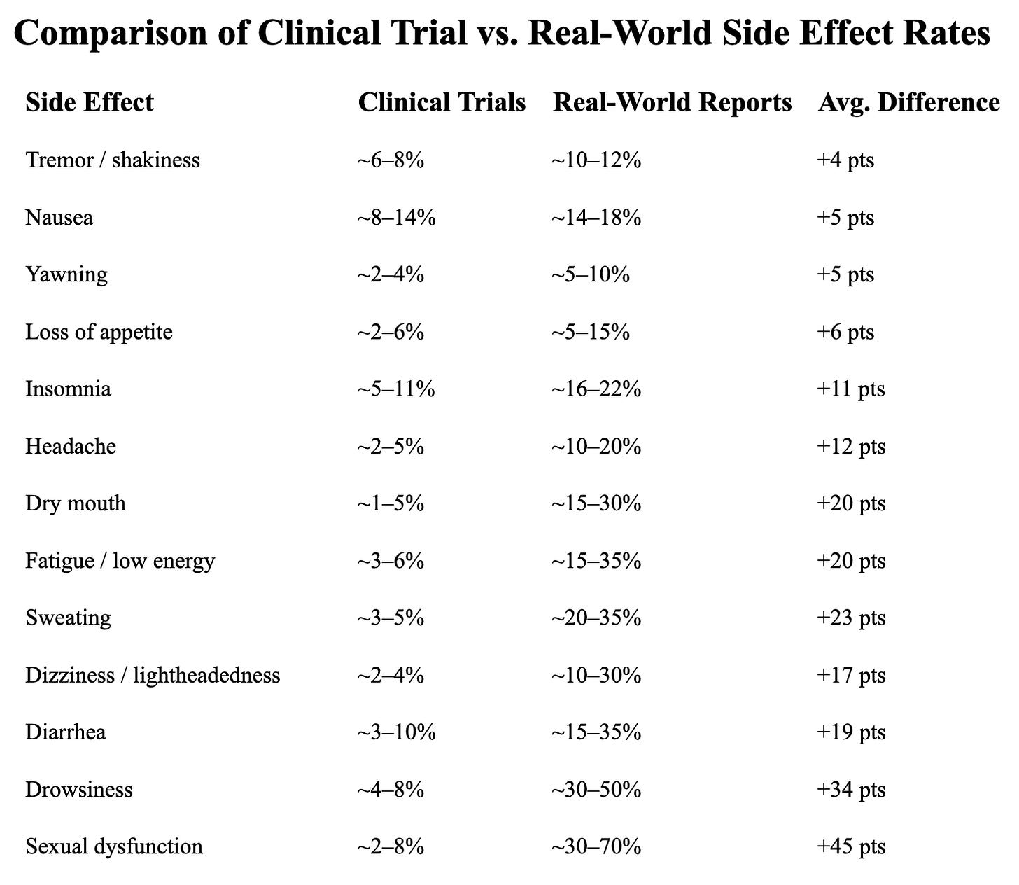 These ranges reflect synthesized estimates across clinical trial tables and multiple independent studies, rather than coming from a single source. Clinical trial estimates are also derived from short-term, placebo-controlled studies, while real-world estimates come from patient reports and observational research using different methods. Thus, these figures are not directly equivalent, but offer a useful comparison of what is measured in each context.